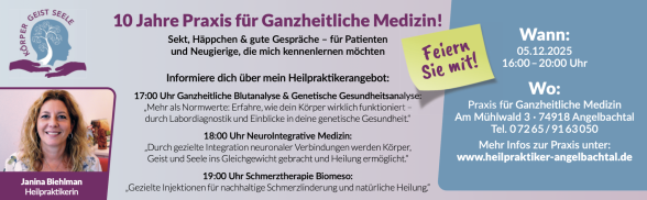 Ich freue mich Sie am 05.12.2025 ab 16 Uhr zu meinem 10 jährigen Jubiläum in meiner Praxis in Angelbachtal begrüßen zu dürfen.